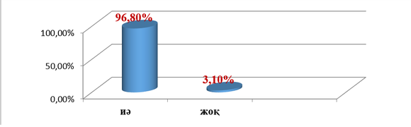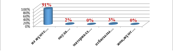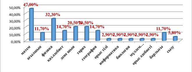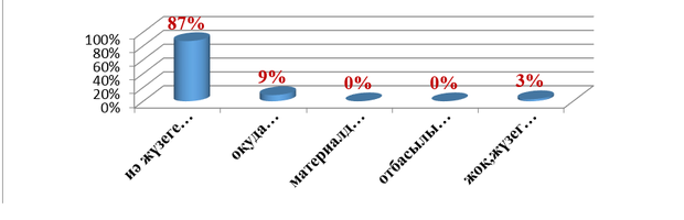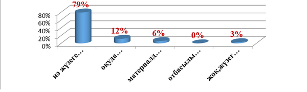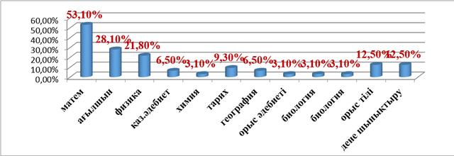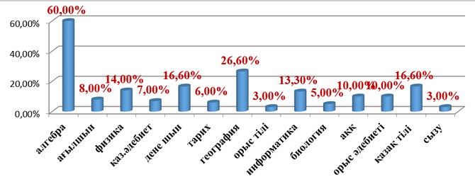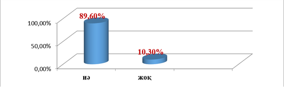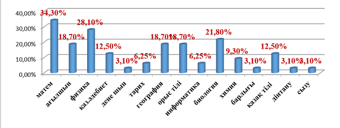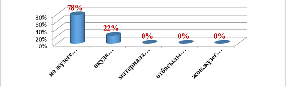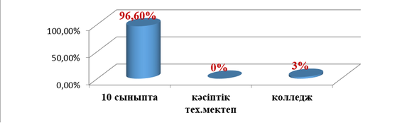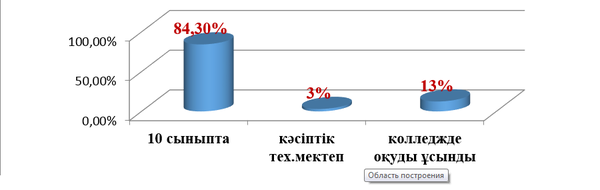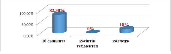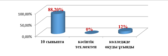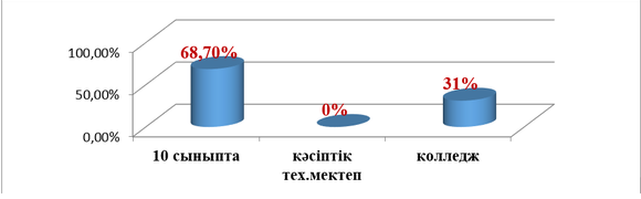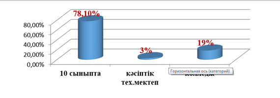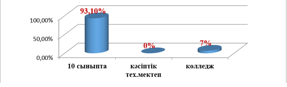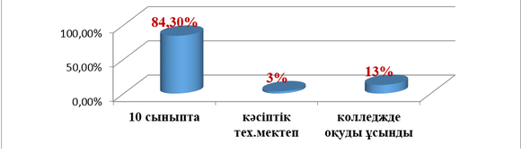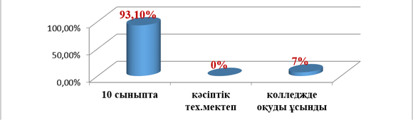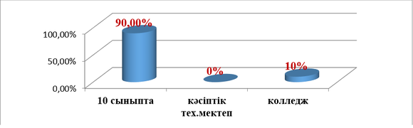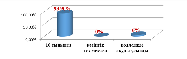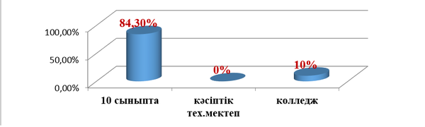 Оқушылардың мамандыққа икемділігін зерттеу барысында 9-сыныптан «Сенің кәсіби ой-ниетің» сауалнамсы жүргізілді. Сауалнама 8-сұрақтан тұрады. Оқушылардың мамандық таңдау барысында жауабы 78%-ы мамандық адамның қабілетіне, бейіміне байланысты деп тұжырымдалды.